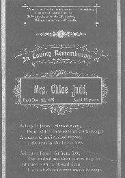 | Picture #2 is a photograph of the death announcement of "Mrs. Chloe Judd". The announcement was typical of the time period, and was sent to relatives and friends to announce the death. The announcement was from a 4" x 6" cabinet card. The card read "In Loving Remembrance of Mrs. Chloe Judd, Died Dec. 21, 1887, Aged 85 years". There are also two poems on the announcement. The announcement was in the possession of the descendants of William Wesley McDonald and Lucinda Mariah Emmerson. Chloe A. Shippy Judd died at Grove Lake, Pope County, Minnesota. |