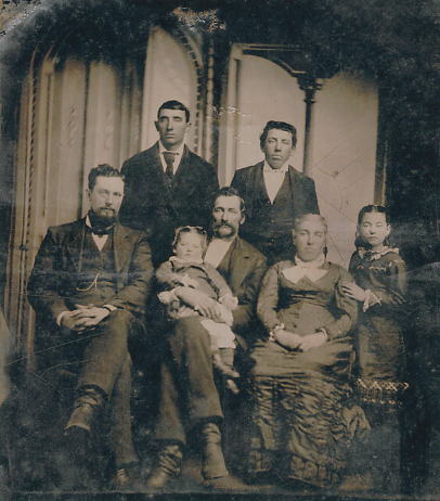 | Picture #19 is a picture of the family of Peter Mohler and Rueann Lanphear. This picture is from a tin type owned by Helen M. Fromi. It was taken about 1881, when Etta was about age two. Back Row, left to right, is Andrew Jackson Mohler (1863), and Jason Lanphear Mohler (1864). Front row, left to right, is unknown (perhaps Peter's Brother Jacob Mohler), Etta Rueann Mohler (1879) (on lap), Peter Mohler (1837), Reuann Lanphear (1847), and Sarah Bernice Moher (1874). It was claimed that the unknown man was the family Doctor who insisted on being in the picture. This photo was sent by Jim Fromi, Son of Helen Fromi. |