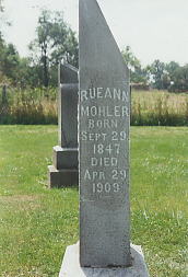 | Picture #17 & Picture #18 are photos of the cemetery stones of Peter Mohler and Rueann Lanphear Mohler. Peter and Rueann are buried at Westview Cemetery in Kirkville, Wapello, Iowa. The photos were taken in 1996. There is one stone for both Peter and Rueann, with the inscriptions on opposite sides. |