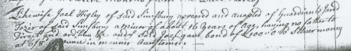 | Picture #1 is from the Simsbury Connecticut Probate Records, dated 28 March 1780, and reads as follows "Likewise Joel Higley of said Simsbury appeared and accepted of guardian to Jared Tozer of said Simsbury a minor of about 16 years of age, having no father to direct and Ord[e]r him, and ye said Joel gave bond of 1000.00? pounds silver money at 6/8 ounce in manner accustomed." |