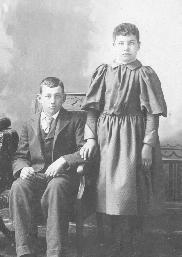 | Picture #16 is a photo of Andrew Jackson Mohler and Elizabeth Ann Stiles. The photo was taken in 1885, probably at their wedding or shortly before or after. Andrew was age 22 and Elizabeth, age 19. The wedding took place at the home of Elizabeth's Mother, Sarah Jane Lewis Stiles, in Fairfield, Jefferson, Iowa. A copy of the photo came from a negative in the possession of Carol Mohler Gifford. The original may have been a cabinet card. |