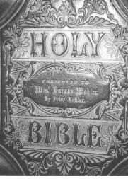 | Picture #6 is a picture of the bible belonging to Peter Mohler and Rueann Lanphear. Peter Mohler gave the bible to Rueann as a gift. The cover of the bible is engraven as follows "PRESENTED TO Mrs. Rueann Mohler, By Peter Mohler". The bible is in the possession of John Mohler, descendant Jesse Alvin Mohler. |