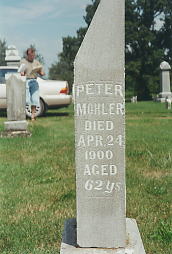 | Picture #17 & Picture #18 are photos of the cemetery stones of Peter Mohler and Rueann Lanphear Mohler. Peter and Rueann are buried at Westview Cemetery in Kirkville, Wapello, Iowa. The photos were taken in 1996. There is one stone for both Peter and Rueann, with the inscriptions on opposite sides. |