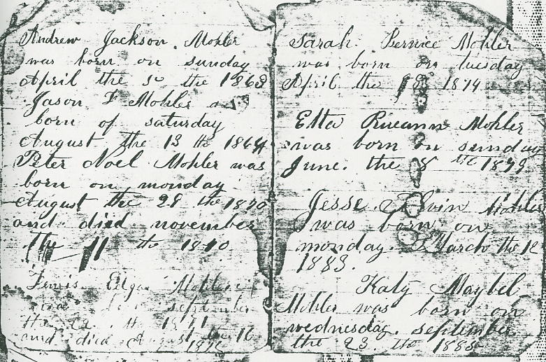 | Picture #20 is a photocopy of the family records of Peter Mohler and Rueann Lanphear. These pages were in the possession of the descendants of Jesse Mohler, Son of Peter Mohler and Reuann Lanphear. They give the birth dates of all the children of peter Mohler and Reuann Lanphear. |