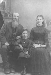 | Picture #3 of Thomas S. McDonald, Susan Good, and their daughter Violet Belle McDonald was also taken about 1888. This picture was taken from a 4" x 6" Cabinet Card. It was evidently a reprint of an original tin type. This is evident from the fact that the items in the background of the picture are reversed from those in #1 and #2 above. The bottom of the picture is identified by "Rich, Sauk Centre, Minn", probably the photo studio that reproduced the photo from the originial tin type. This picture was in the possession of the descendants of William Wesley McDonald, son of Thomas S. McDonald and Susan Good. |