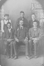 | Picture #5 was taken from a Tin Type in the possession of the descendants of Violet Belle McDonald. Those in the picture are as follows: Top Row, Left to Right, is Cora Pennie who later married Albert Calvin McDonald, Son of Thomas and Susan; Julius Clarence McDonald, Son of Thomas and Susan; Clara Lucinda McDonald, Daughter of Thomas and Susan. Bottom Row, from Left to Right, is Leslie Pennie, later the husband of Mary Ellen McDonald, Daughter of Thomas and Susan; Amby? Walker, perhaps a friend or teacher; and John Walter McDonald, Son of Thomas and Susan. The photo was taken about 1889. |