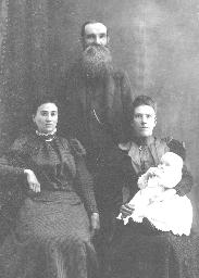 | Picture #6 is a picture of Thomas S. McDonald, his second Wife Minnie A. Ward, Clara Lucinda McDonald, and Clara's child, probably Clarence Arthur Kreuger. This original picture is a 4" x 6" Cabinet Card and was taken about 1899. The picture is marked with "A.E. Strandbert, Henning, Minn". The back of the picture is written, Dr. McDonald & 2nd wife, Clara & Child". This picture was also in the possession of the descendants of William Wesley McDonald. |