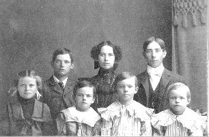 | Picture #8 is a photo of seven of the children of William Wesley McDonald and Lucinda Mariah Emmerson. The photo was taken about 1900 from a 5" by 7" photograph pasted on an 8 1/2" by 11" cardboard. Those in the photo are as follows: Top Row, Left to Right, is Joseph Arthur (1887); Annie Ellen (1883); and William Henry (1886). The bottom row, from Left to Right is Maud Lucinda (1892); Leon John (1897); Clarence Clinton (1893); and Charles LeRoy (1895). The oldest daughter, Gertrude Luella married in 1899 and two children Mary Susan (1890) and David Howard (1891) were deceased. Daisy Pearl (1903) had not yet been born. The picture is labeled with "G. W. Glanville, Blackfoot, Idaho". |